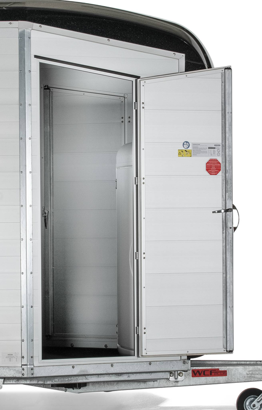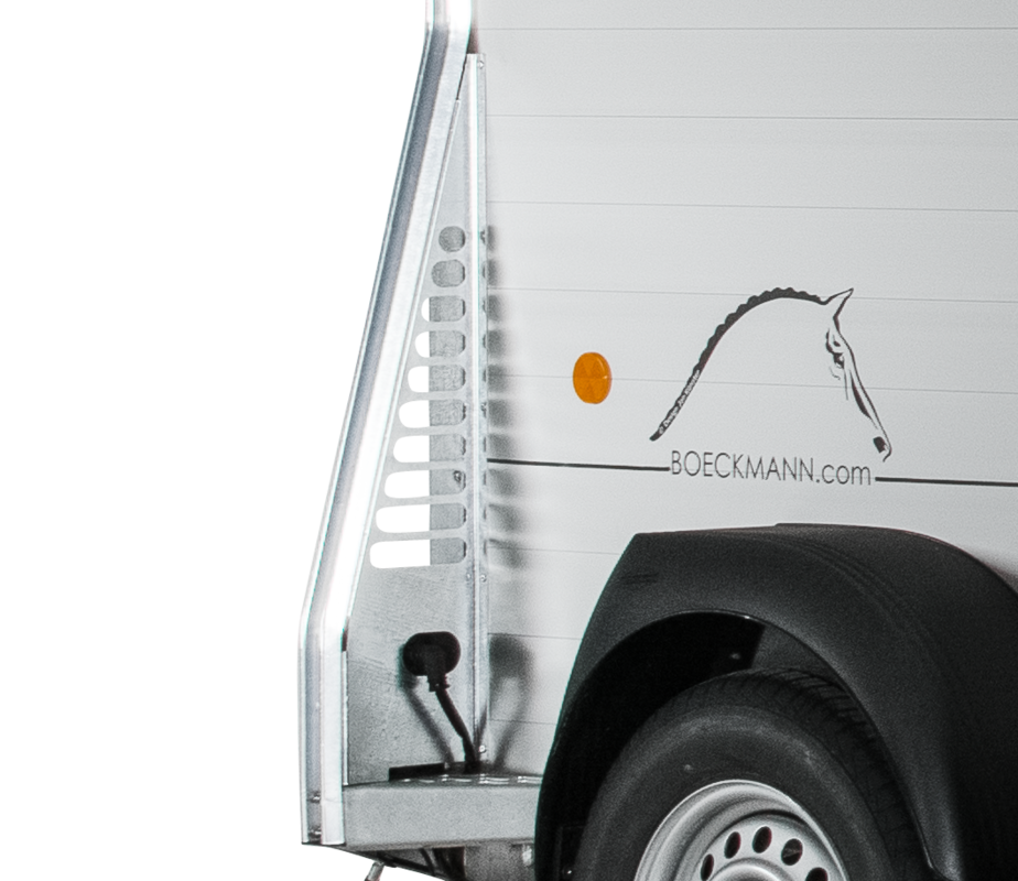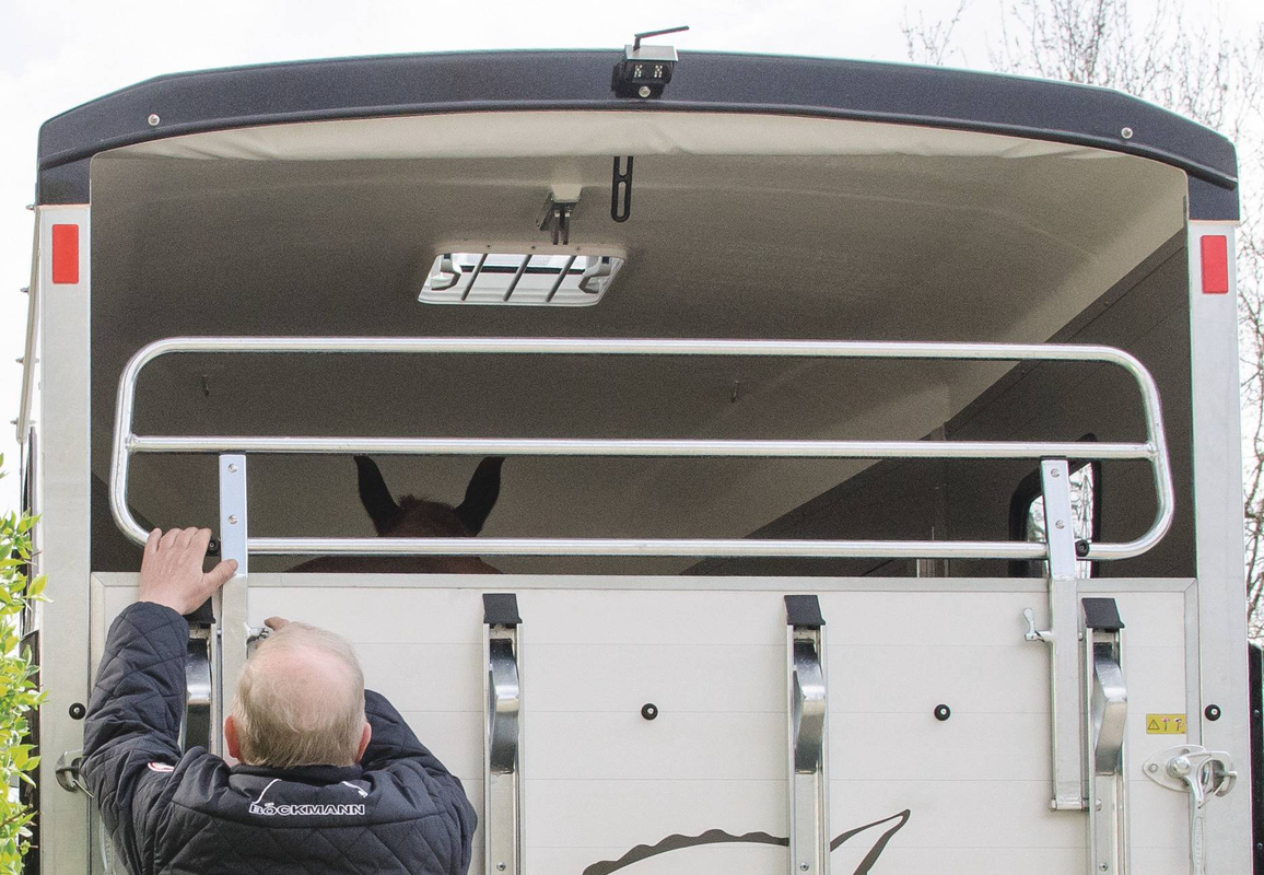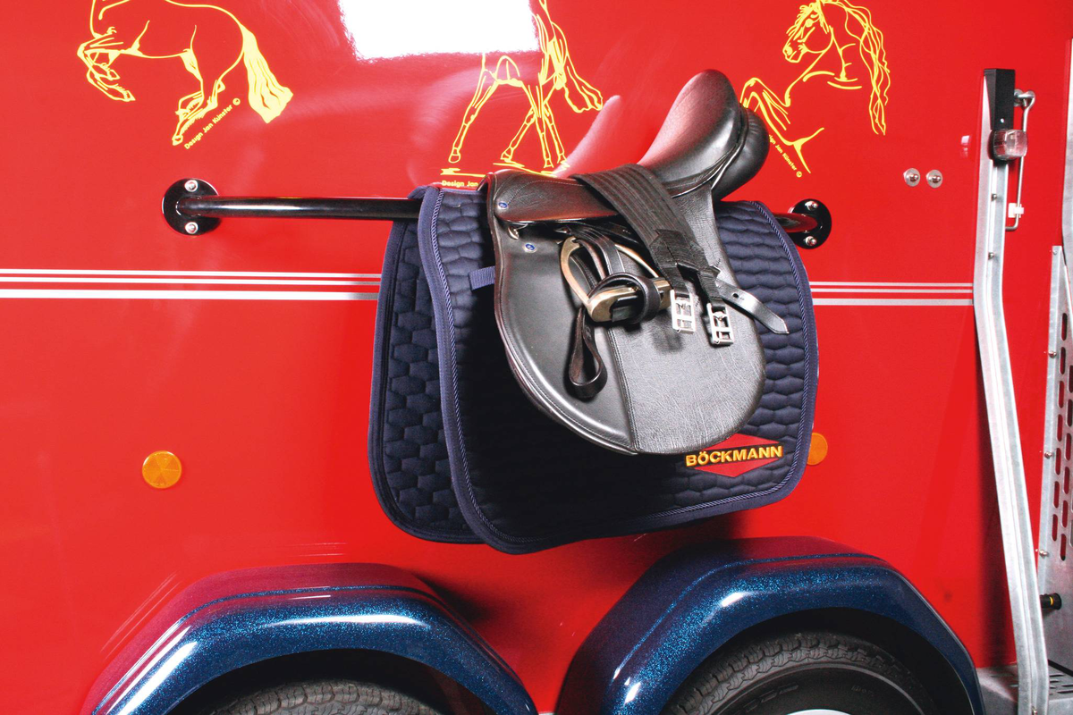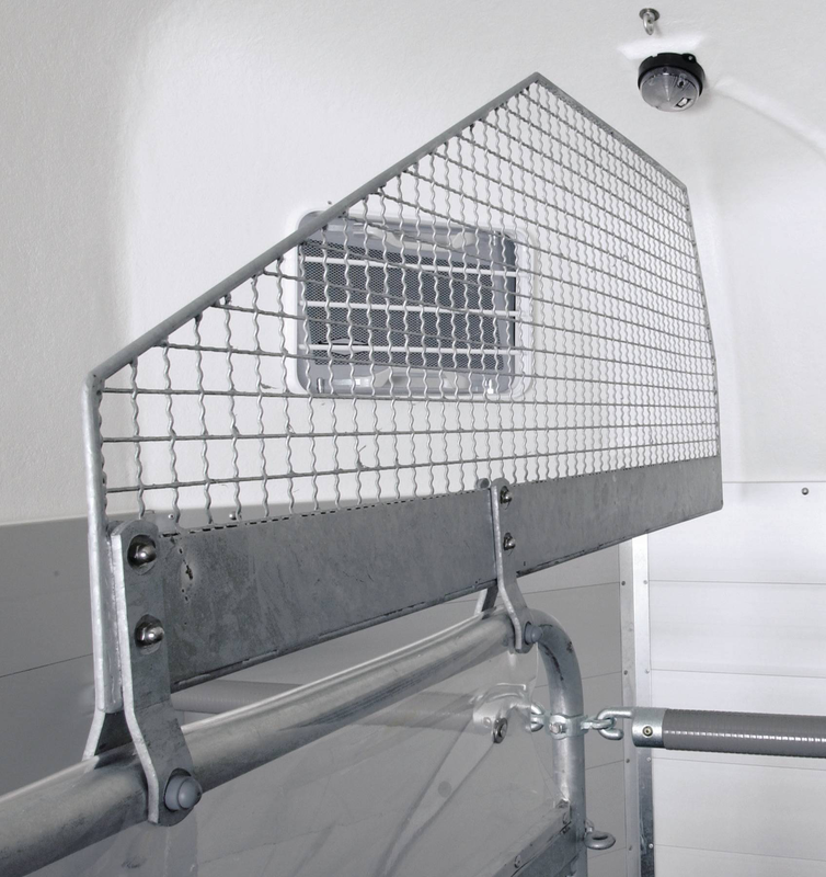 Gummiboden verklebt und versiegelt, Gummi auf Beladeklappe (integrierte Trittleisten) und Seitenstopp, Kunststoffschaufel mit Stiel, Besen mit Teleskopstiel, Boxenstangen-Zusatzpolsterung (pro Boxenstange), Innenbeleuchtung, Multi Safe System (Sicherheitsboxenstangen-System), Option Futtertrog, Profi-Sattelhalter, für 2 Sättel, Seitenpolsterung (2 Stück), Trittschutz seitlich, Kunststoff (schwarz), Mittelpfosten-Trennwand (hinten und vorn schwenkbar) mit Polsterung