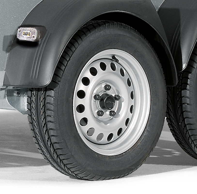 Kugelkupplung abschließbar, Mechanische Auflaufbremse, Bereifung 14", Stahlfelge, Längsträgerfahrgestell mit V-Deichsel (geschraubt), Stützrad automatik, Tiefergelegtes WCF-Fahrwerk